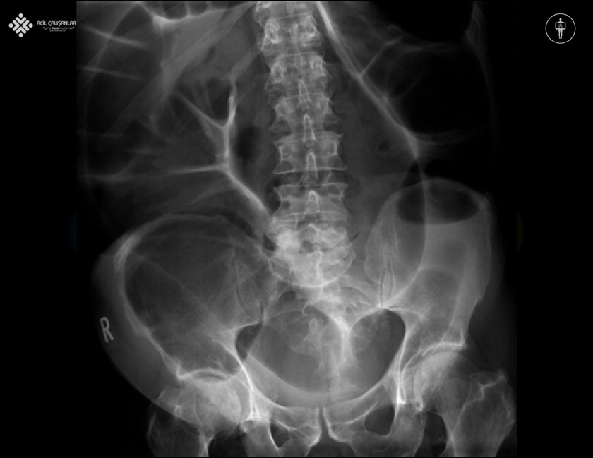 70 yaşında erkek hasta karın ağrısı şikayeti ile acil servise ayaktan başvuruyor. Hasta değerlendirildiğinde öyküsünde 3 gündür kramp tarzında ağrısının olduğu, son 5 gündür dışkılama yapmadığı belirtiliyor. Ayrıca ara ara benzer karın ağrılarının olduğu ifade ediliyor. Hasta yeşil alanda muayene ediliyor ve genel durumu iyi, vitalleri: nabız: 86 atım/dk düzenli; solunum: 18/dk; SpO2: %98; kan basıncı: 110/75 mmHg olarak ölçülüyor. Batın muayenesinde karın hafif distandü, barsak sesleri azalmış, defans ve rebound hassasiyeti yok olarak değerlendiriliyor. Muayene sonrasında acil hekimi hastadan batın grafisi ve kan tetkikleri istiyor. Hasta röntgene alanına gidip aşağıda görülen grafiyi çektiriyor ve hemen doktoruna başvuruyor. Bundan sonraki yaklaşım ne olmalıdır?