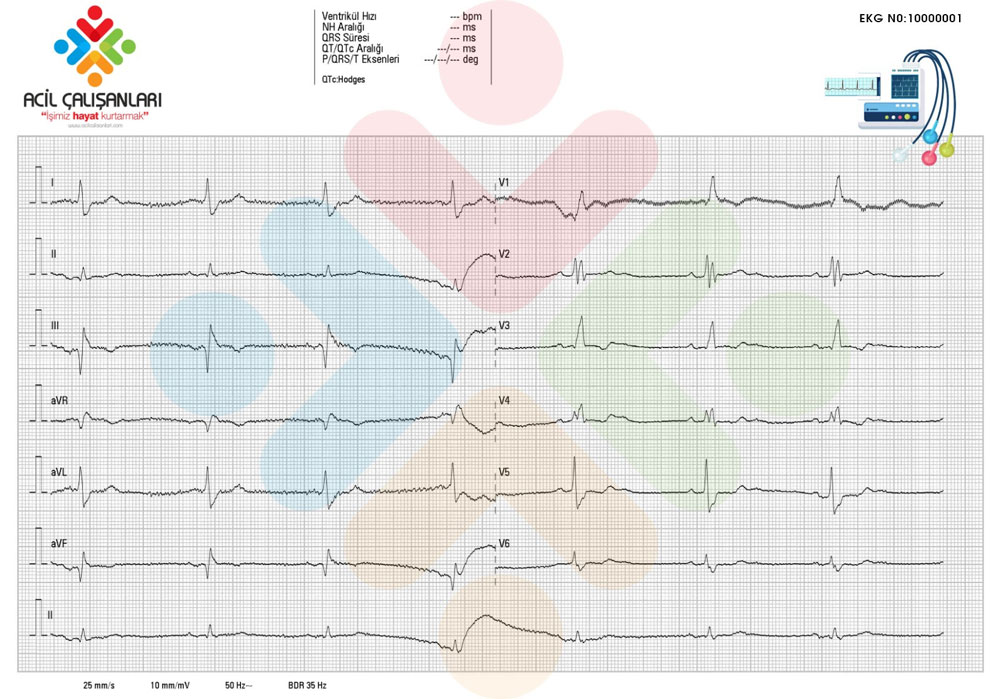 - Sağ dal bloğu ile uyumlu V1-V2-V3 geniş QRS ve RSR şeklinde “M” şeklini andıran QRS kompleksleri görülmekte.