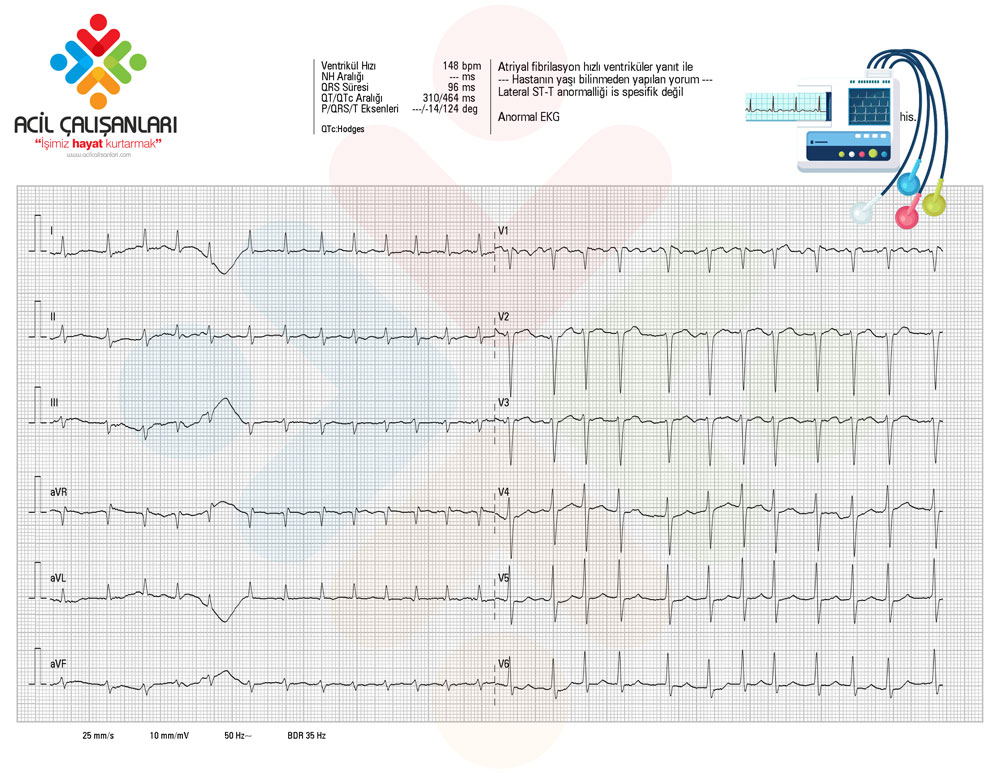 60 yaşında, bilinen hipertansiyon öyküsü olan bir erkek hasta, bir saattir devam eden ani başlangıçlı çarpıntı ve nefes darlığı hissi şikayetiyle acil servise başvuruyor.
