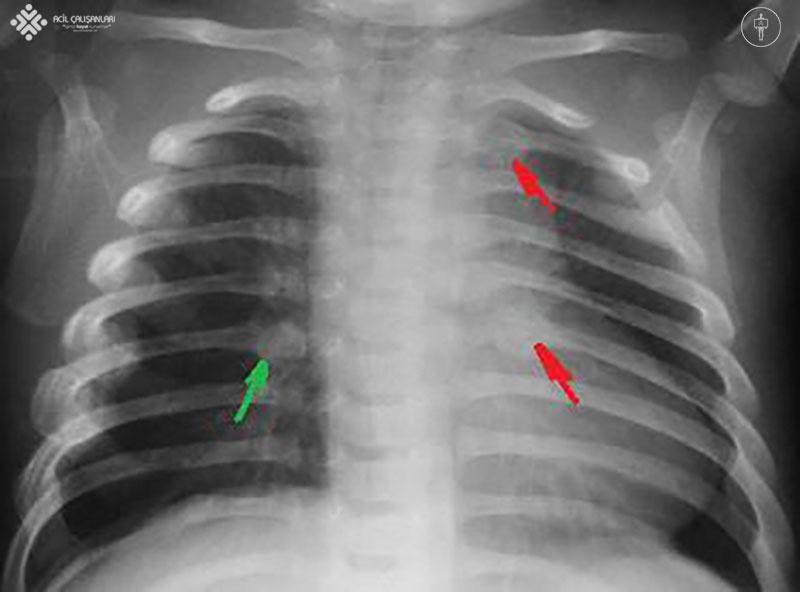 4 aylık bir kız çocuğunu annesi soluk almama nedeni ile acil servise getiriyor. Annesinden alınan mevcut hastalık öyküsünde, çocuğun 30 saniye nefes almadığını, dudaklarının maviye döndüğünü ve annesinin ağzından soluk vermesi ile nefes almaya devam ettiğini söylüyor. Anne ayrıca hastanın olaydan önce hiçbir semptomunun olmadığını belirtiyor. Çocuk anne sütüyle besleniyor ve tüm aşıları yapılmış. Fizik muayenede hasta uyanık ve ağlıyor, oksijen satürasyonu oda havasında %97 ve her iki burun deliğinde kurumuş kan mevcut. Kalp, akciğer ve karın muayenesi bulguları normal. Hastanın laboratuvar testleri normal. Çekilen beyin BT'sinde akut bulgu görülmüyor. Hastanın göğüs röntgeni aşağıda verilmiştir. Bu hasta için en olası tanınız nedir?