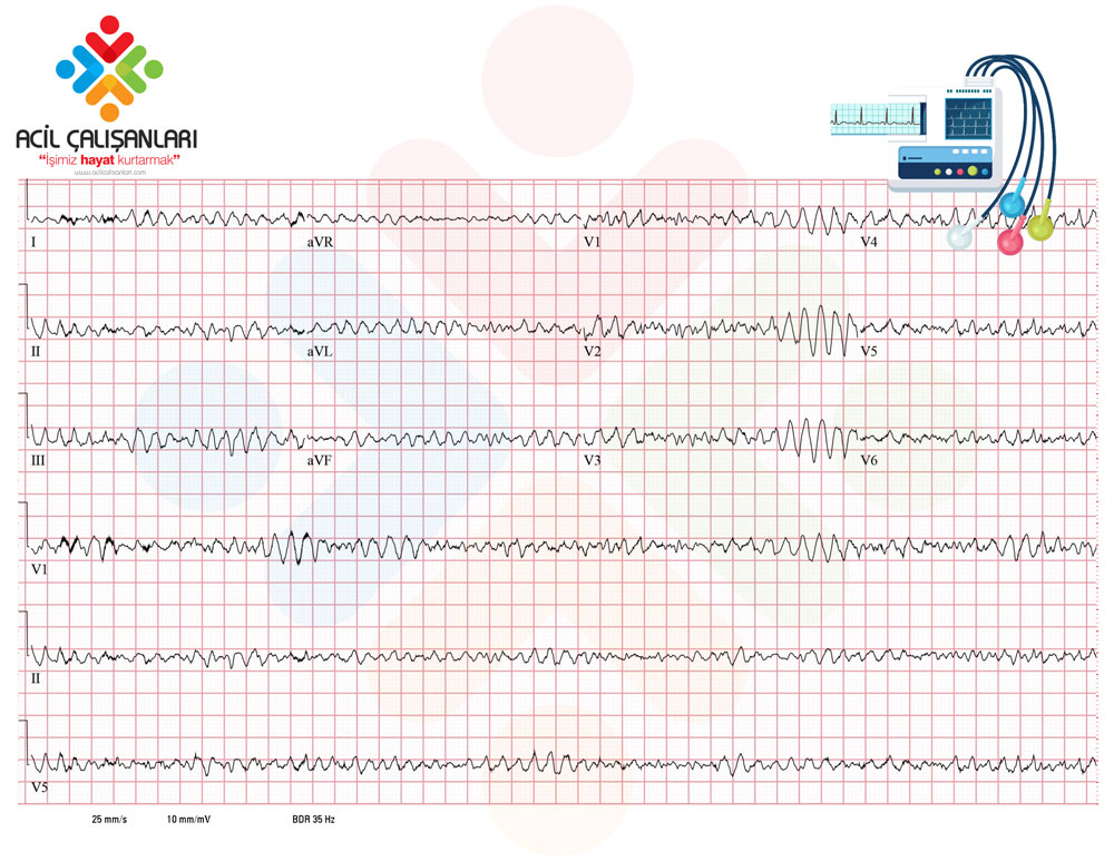 Acil servise getirildiğinde hastanın bilincinin kapalı, solunumunun olmadığı (apneik) ve santral nabızlarının (karotis, femoral) alınamadığı saptanıyor. Hastaya hemen temel yaşam desteği (kardiyopulmoner resüsitasyon - KPR) başlanıyor ve hasta monitörize ediliyor ve EKG çekiliyor.