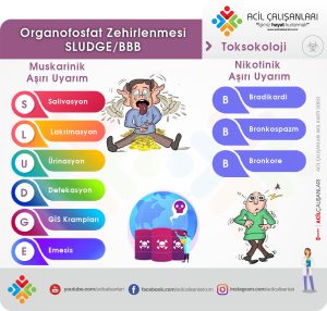 Klinik senaryo organofosfat zehirlenmesi olan bir hastayı tanımlamaktadır. Organofosfat zehirlenmesi klasik SLUDGE veya DUMBELS semptomatolojisi ile kendini gösterir. Organik fosfatlar (Organofosfatlar) veya karbamatlar tarımda böcek zehiri (insektisit) olarak kullanılan, ucuz ve kolay ulaşılabilir maddelerdir. Her ikisede asetilkolinesterazı (AChE ) geri dönüşsüz inhibe ederek etki gösterir.