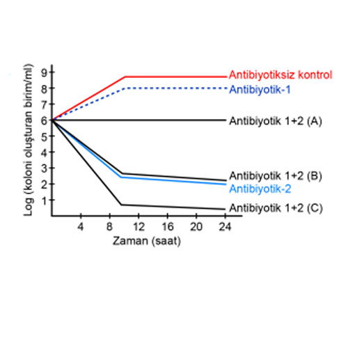 Yukarıda iki ayrı antibiyotiğin (Antibiyotik-1 ve Antibiyotik-2) bir bakteriye karşı tek başına ve birlikte uygulanması ile elde edilen zamana karşı üreme eğrileri görülmektedir. Bu iki antibiyotiğin kombine kullanımı ile elde edilen sonuçlarla ilgili aşağıdaki açıklamalardan hangisi doğrudur?
