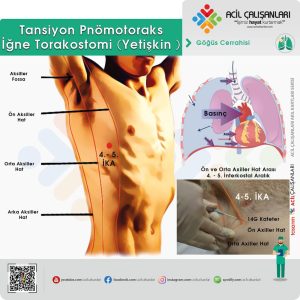 E) Hasta tansiyon pnömotoraks olarak değerlendirilir. Öncelikle acil iğne dekompresyonu ; sağ 5. İnterkostal aralıktan turuncu branül (14 G) ile girilerek yapılır.