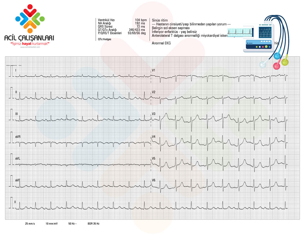 C) Çekilen EKG’i anormal olarak değerlendirilmeli. Bu yüzden hastada hemogram, kardiyak enzimler ve geniş biyokimya paneli istenmelidir. Sonuç çıkınca hasta tekrar değerlendirilmelidir.