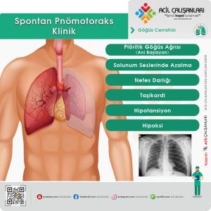 Çoğu hasta; ani başlayan akut plöritik göğüs ağrıdan yakınır ve etkilenen bölgede solunum sesleri azalır. Dispne nispeten daha hafif olabilir ya da hiç olmayabilir. Yüksek hacimli pnömotoraks; dispne, taşikardi, hipotansiyon ve hipoksiye (siyanoz) neden olur. Bu nedenle başlangıçta bu tanı olasılığını akıldan çıkarmamak gerekir. Bu nedenle pek çok hastada özellikle de Primer Spontan Pnömotorakslı olanlarda semptomların başlamasından günler sonra ortaya çıkarlar. Bu süre ne kadar uzunsa re-ekspansiyona bağlı pulmoner ödem risk de o kadar yüksektir. Tanıda esas olan radyolojik değerlendirmenin erken ve doğru olarak yapılması, olası ölümcül komplikasyonları önlemesi yönünden büyük önem taşır. Standart tanı modalitesi olan PA akciğer grafisi sadece %83 sensitiftir. Ama şüpheli durumda BT ile %100 duyarlılıkla pnömotoraks tanısı konabilir. Ultrasonografininde sensitivitesi % l00’e yakındır.