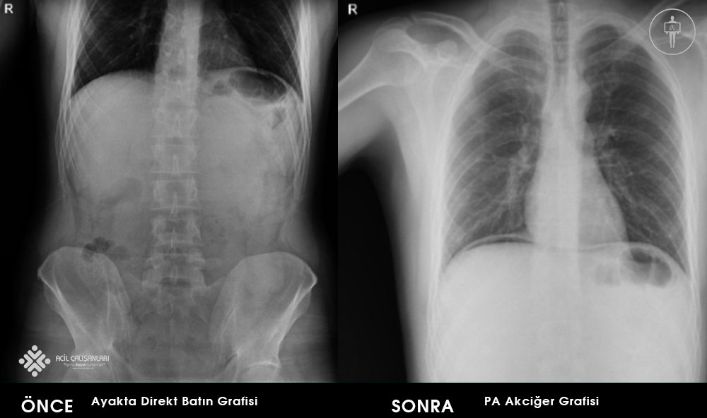 Gastrointestinal kanal perforasyonu peptik ülser hastalığı, travma, iyatrojenik, yabancı cisim, apandisit, enflamasyon, tümör gibi nedenlerle ortaya çıkmakta ve erken tanı ve zamanında cerrahi müdahale ile mortalitesi ve morbitesi oldukça azalmaktadır. Gastrointestinal kanal perforasyonnları mortal seyrettiği için gözlem alıntında tutulmalı, oral stoplanmalı ve ana tedavi yöntemi cerrahi olduğu için hasta bir an önce genel cerrahiye danışılması gerekmektedir. Ayakta batın grafisi acillerde, akut karın ağrılarının değerlendirilmesinde ayakta batın grafisi sık olarak istenmektedir. Akut karın ağrısının tanısal incelemesinde akciğer ve karın grafilerinin yeri ile ilgili yapılan yayınlarda, grafilerin tanı konulmasındaki etkinliklerinin ve tedaviyi yönlendirmelerinin oldukça kısıtlı olduğu, akut karın ağrısı şikayeti ile acil servise başvuran her hastadan direkt grafi tetkiki istenilmesi halinde, tanıya yardımcı patolojik bulgu elde edilme oranı ortalama %10 olduğu gözlemlenmektedir. Bu yüzden acil cerrahi hastalıklar arasında en sık intestinal obstrüksiyon ve gastrointestinal perforasyon için karın grafilerinin tanısal etkinliği etkinliğe sahiptir. Bu yüzden klinik ve fizik muayene bulguları intestinal obstrüksiyon ve gastrointestinal perforasyon lehine değerlendirilen hastalarda direkt karın grafisi ilk tetkik olarak istenmelidir. Ancak, akut apandisit dâhil diğer akut karın patolojilerinde direkt karın grafilerinin kullanılması yetersiz tanısal etkinlik ve radyasyon riski açısından uygun gözükmemektedir.