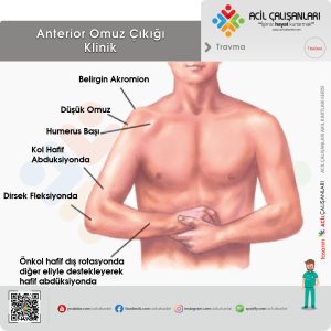 Sık görülen çıkık omuz semptomları arasında belirgin omuz ve kol ağrısı, omuz zayıflığı, kol uyuşması ve sınırlı hareket açıklığı bulunur. Omuz öne çıkıklarında yoğun ağrı ve hareketsizlik olur. Humerus başı omuz anteriorunda şişlik olarak gözle görülebilir, palpe edilebilir. Omuzun normal görüntüsü kaybolmuş, omuz oval hattını yitirmiştir. Omuz yuvarlak konturundan yoksundur karemsi bir görünüm almıştır. Akromiyon lateral kenarı belirgindir. Omuzu çıkmış hasta kolunu hafif dış rotasyonda ve diğer eliyle dirsekten destekleyerek hafif abduksiyonda tutarak taşır. Hasta abdüksiyon ve internal rotasyona direnç gösterir.