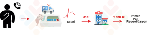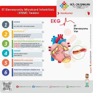 Anjina (göğüs ağrısı), ana koroner arterlerin daralması ya da bazen tam tıkanması sonucu oluşan ve kalbin ihtiyacı olan oksijeni alamamasına bağlı olarak gelişen iskemik bir durumdur. Yaşamı tehdit eden bu durum genelde göğüste ağrı veya sıkıntı ile prezente olur. Kalbi besleyen koroner damarların tam olarak tıkanması sonucunda oluşan iskemin yansıması olarak EKG de ST segment elevasyonu görülür. Hastamızın EKG'sinde prekordiyal derivasyonlarda (V1-V2-V3-V4 ) ST elevasyonu mevcut. Bu elevasyon akut anterior miyokard infarktüsü (Mİ) sol koroner arter (LAD) trombozu nedeniyle meydana gelir. Oluşan bu iskemik duruma ST-segment yükselmeli akut miyokart enfarktüsü (STEMI) denir. STEMI’de koroner damarlar NSTEMI’ye (ST-segment yükselmeli olmayan akut miyokart enfarktüsü ) kıyasla daha uzun bir süre boyunca pıhtıyla tıkanır; bu da belirgin enfarktüse neden olur. STEMI görülen hastalarda, kalp kasındaki hasarın sınırlandırılması ve hastanın ölümüne neden olmaması için, etkilenen damarın tıkanıklığının hemen açılması gerekir (revaskülarizasyon). Eğer pıhtının erimesi çok kısa zaman içinde olursa, oluşacak infarktüs alanı küçük olur ve ventrikül fonksiyonları bozulmadan veya çok az etkilenerek kalır.