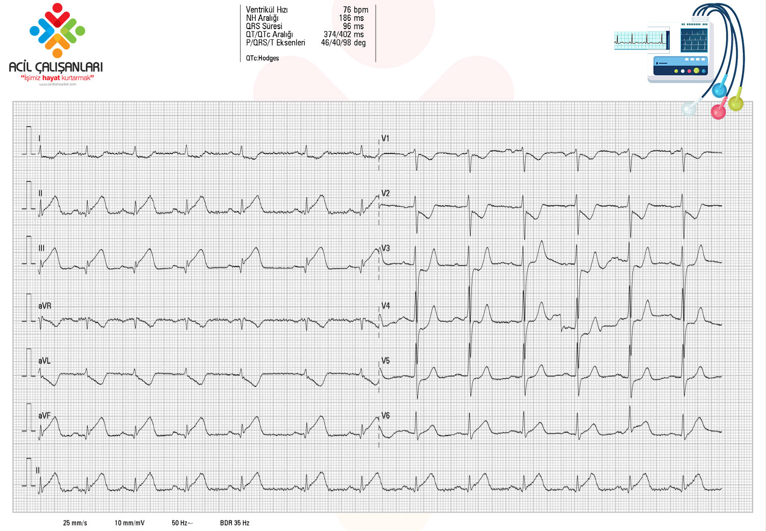 Hastanın EKG'sinde saptanan inferior ST elevasyonları (DII, DIII, aVF) ve anterior ST çökmeleri, kalbin hem alt hem de arka duvarını etkileyen, yüksek riskli bir inferoposterior STEMI (kalp krizi) tanısını koydurur. Anterior derivasyonlardaki (V1-V3) bu ST çökmeleri, posterior duvardaki ST yükselmesinin ayna görüntüsüdür ve özellikle V2 derivasyonundaki çökmenin daha belirgin olması posterior tutulumu kuvvetle destekler. Bu durum kalp kasının geniş bir alanının risk altında olduğunu gösterdiğinden, hasta derhal kırmızı alana alınmalı, acil kardiyoloji konsültasyonu istenmeli ve vakit kaybetmeden anjiyografiye hazırlanmalıdır.