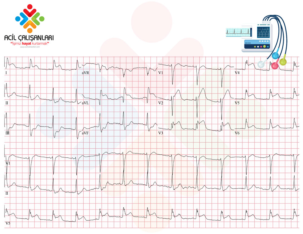 - Bu hastanın EKG'sinde V1-V6, DI ve aVL derivasyonlarında ST elevasyonu görülmesi, kalbin hem ön (anterior) hem de yan (lateral) duvarını etkileyen, geniş bir Anterolateral STEMI tanısını koydurur.