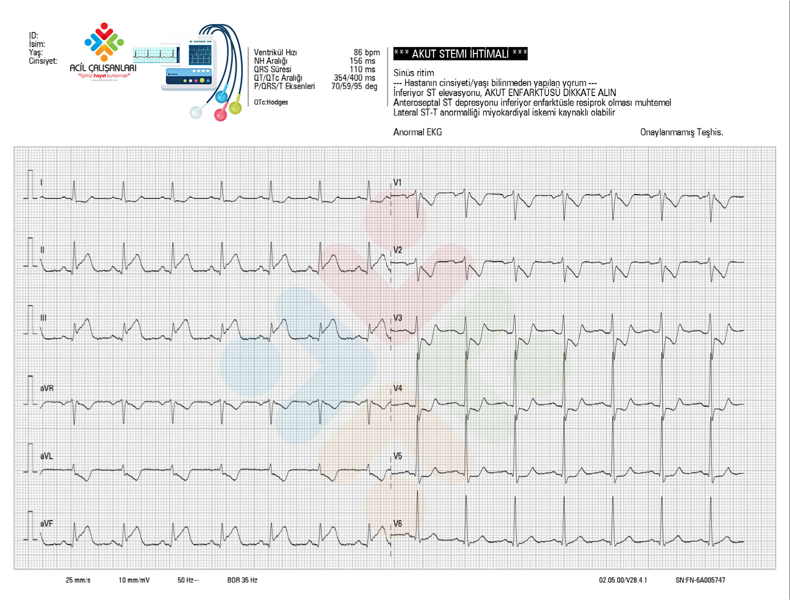 - Bu iki bulgu birleştiğinde, hastanın tam tanısı Posterior-inferior STEMI olur. Bu, kalp kasının geniş bir alanının risk altında olduğu, mortalitesi yüksek bir durumdur ve tıkanan koronerlerin bir an önce açılması için hastanın acilen anjiyografi yapılabilecek bir merkeze nakledilmesi gerekir.