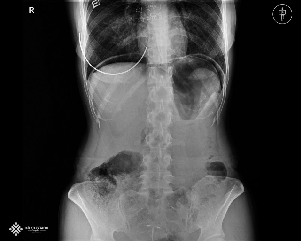Hastamızda ADBG’sinde diyafram altında serbest hava görünmekte buda bize gastrointestinal perforasyonu düşündürmektedir. Gastrointestinal kanal perforasyonu peptik ülser hastalığı, travma, iyatrojenik, yabancı cisim, apandisit, enflamasyon, tümör gibi nedenlerle ortaya çıkmakta ve erken tanı ve zamanında cerrahi müdahale ile mortalitesi ve morbitesi oldukça azalmaktadır. Gastrointestinal kanal perforasyonnları mortal seyrettiği için gözlem alıntında tutulmalı, oral stoplanmalı ve ana tedavi yöntemi cerrahi olduğu için hasta bir an önce genel cerrahiye danışılması gerekmektedir. Ayakta batın grafisi acillerde, akut karın ağrılarının değerlendirilmesinde ayakta batın grafisi sık olarak istenmektedir. Akut karın ağrısının tanısal incelemesinde akciğer ve karın grafilerinin yeri ile ilgili yapılan yayınlarda, grafilerin tanı konulmasındaki etkinliklerinin ve tedaviyi yönlendirmelerinin oldukça kısıtlı olduğu, akut karın ağrısı şikayeti ile acil servise başvuran her hastadan direkt grafi tetkiki istenilmesi halinde, tanıya yardımcı patolojik bulgu elde edilme oranı ortalama %10 olduğu gözlemlenmektedir. Bu yüzden acil cerrahi hastalıklar arasında en sık intestinal obstrüksiyon ve gastrointestinal perforasyon için karın grafilerinin tanısal etkinliği etkinliğe sahiptir. Bu yüzden klinik ve fizik muayene bulguları intestinal obstrüksiyon ve gastrointestinal perforasyon lehine değerlendirilen hastalarda direkt karın grafisi ilk tetkik olarak istenmelidir. Ancak, akut apandisit dâhil diğer akut karın patolojilerinde direkt karın grafilerinin kullanılması yetersiz tanısal etkinlik ve radyasyon riski açısından uygun gözükmemektedir.