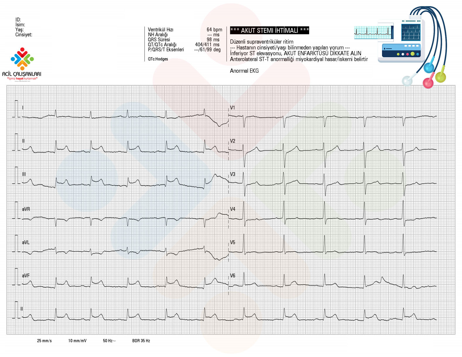 60 yaşında bayan, halsizlik şikayeti ile KKM’e ulaşıyor. Vaka KKM tarafından '' Genel Durum Bozukluğu'' olarak veriliyor. Hastanın Tip 2 diyabet dışında kronik hastalık öyküsü yok. Hasta saat 07: 00 civarında kendini iyi hissetmediğini, uyandığını ve parasetamol almasına rağmen kendini daha iyi hissetmediğini belirtiyor. Arabası olmadığı için hastaneye gidemediğini söylüyor, bu yüzden başka ne yapacağını bilmediği için ambulans çağırmaya karar verdiğini belirtiyor. Eve geri dönerken sorun yaşayacağı için hastaneye gitmek istemediğini 112 ekibine bildiriyor. Hastanın GKS'u 15 Nabız: 92 atım/dk düzenli ; Solunum sayısı: 18/dk ; SpO2: 96 ; KŞ: 128 ve Kan Basıncı: 100/60 mm/Hg olarak değerlendiriliyor. Ekip sorumlusu paramedik nakil reddi almadan önce hastanın EKG’sini değerlendirmek istiyor ve 12 derivasyonlu EKG çekiyor. Bundan sonraki yaklaşım ne olmalıdır ve aşamalarıyla doğru olan seçenek hangisidir ?