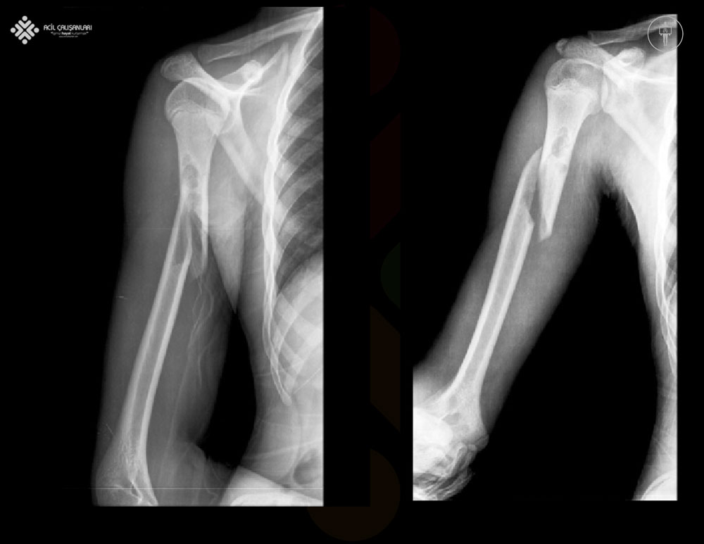 Humerus kırığı olan hastalarda radial sinir yaralanabilir çünkü radial sinir kemiğin lateral sınırındaki radial oluktan geçer. Bu tür bir yaralanmada, hastada bilek ekstansiyonunda zayıflık ve parmaklarını uzatamama görülür. Radial sinirdeki bir lezyon dirsek ekleminin yukarısında olduğunda, hasta radial sinirin dermatomu boyunca önkol ve elde uyuşukluktan da şikayet edebilir. Bilgisayarlı Tomografi (BT), MR kadar hassas olmasa da, acil durumlarda sıklıkla daha önce yapılır ve tarama yöntemi olarak kullanılır. Kontrastlı çekilen beyin tomografisinde görüntüleme bulguları lezyonun evresine bağlıdır. Erken serebrit genellikle düzensiz, düşük yoğunluklu bir alan olarak ortaya çıkar ve bu alan artmaz ya da seyrek olarak yamalı bir şekilde artabilir. Serebrit ilerledikçe, daha belirgin, kenarları genişleyen bir lezyon görünür hale gelir. Geç apsesi olan hastalarda seri BT incelemeleri giderek azalan ödem ve kitle etkisi gösterir. Beyin apsesi duvarı genellikle pürüzsüz ve düzenlidir, 1 mm ila 3 mm kalınlığındadır ve parankimal ödem ile çevrilidir.