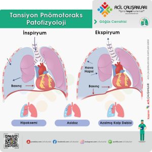 Pnömotoraks, göğüs boşluğu içinde ilerleyen hava birikimidir ve plevral boşluk içinde pozitif bir basınç oluşturur. Bu basınç mediastinal ve intratorasik yapılar üzerine uygulanır. Tek yönlü bir valfin oluşturulması, havanın göğüs boşluğuna girmesine izin verir, ancak çıkmasına izin vermez. Hava hacmindeki artış torasik basıncın artmasına yol açarak ipsilateral akciğerin çökmesine ve kontralateral akciğerin sıkışmasına neden olur. Mediasten akciğerden uzağa kayar, böylece kalbe venöz dönüş azalır. Düzeltilmediği takdirde bu durum obstrüktif şoka kadar ilerleyebilir ve nihayetinde ölüme yol açabilir.