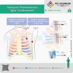 - Yetişkin: Öncelikli müdahale iğne dekompresyon (torakostomi) ama uyulama yeri 2. İKA midklavikuler hat yerine 5. İKA orta axiller hattın biraz önü (anterior ve orta axiller arası) olarak önerilmiş. ATLS kılavuzunda kateter seçimi le ilgili net bir bilgi yok ama uygulama yetişkinler için en düşük 18 G (yeşil 45mm) veya 16 G (Gri 45-50 mm), 14 G (Turuncu 45-50 mm) önerilir.
